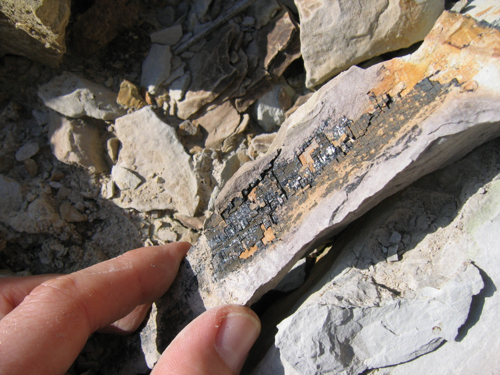 Above: A thin, crushed piece of fossilised wood (lignite).