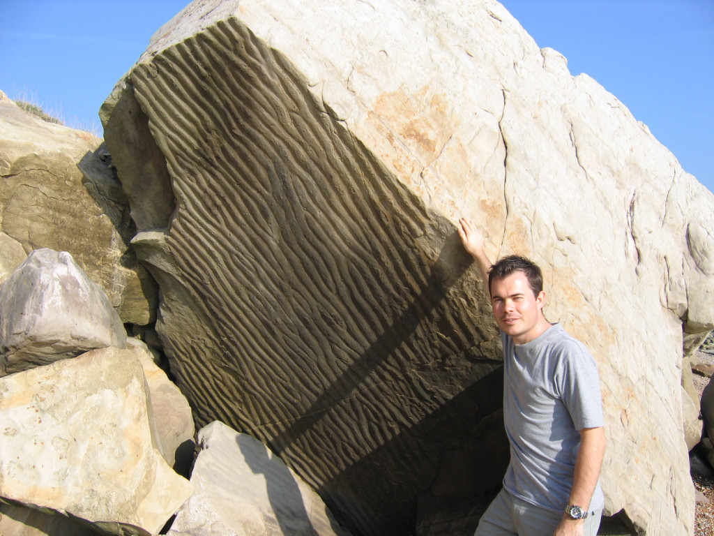 Following exposure in the present day large sections of the cliff collapse onto the beach. As this occurs the two original layers separate along the natural weakness leaving an indented footprint on one surface and a protruding cast on the other (see Fig. 5 above).
